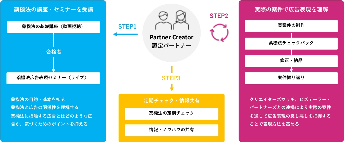 育成対象となるクリエイターは、クリエイターズマッチの認定パートナークリエイターで、バナー・LP制作の実績がある方になります。STEP1では、ビズテーラー・パートナーズが提供する薬機法研修「薬機法スタディテーラー」をクリエイター向けにカスタマイズした講座やセミナーを受講します。STEP2では、実際の案件で実績・経験を積むことで適正な広告表現や効果を出す方法を身につけてゆきます。STEP3では、薬機法の定期チェックおよび事例を定期的に共有することでレベルを継続的に維持してゆきます。
