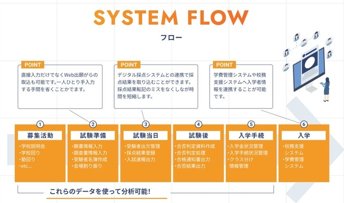 ⑧ 他システムへの連携:WEB出願やデジタル採点等の他社システムとの連携ができます。運用中のシステムを使っていただきながらシームレスな連携をサポートします。