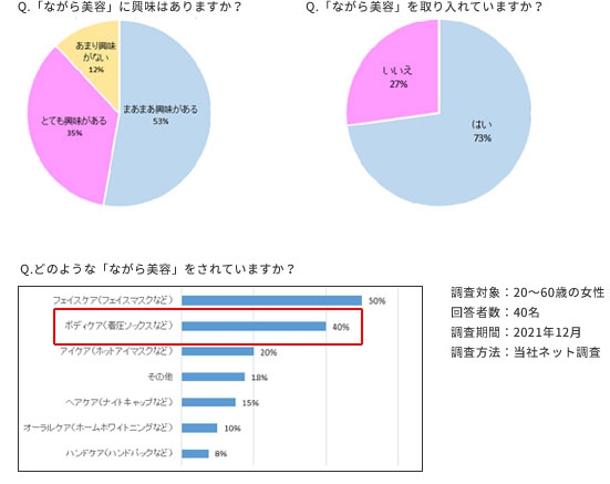グンゼが行った「ながら美容」に関する調査では、「ながら美容」に興味があると答えた方は88%と非常に高く、また、「ながら美容」を実際に取り入れている人も73%と多くの方が実践されています。実際に取り入れている「ながら美容」ではフェイスケアに次いでボディケア(着圧ソックスなど)の割合が高いことが分かりました。