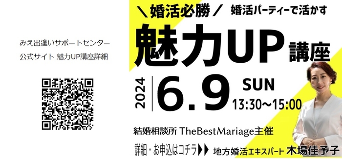 結婚相談所を運営するザベストマリアージュ(所在地:三重県伊勢市、代表:木場 佳予子)は、独身男性・女性を対象とした\婚活必勝/魅力UP講座を6月9日(日)に三重県・松阪市のCAFE Knulp(カフェクルヌプ)にて行います。