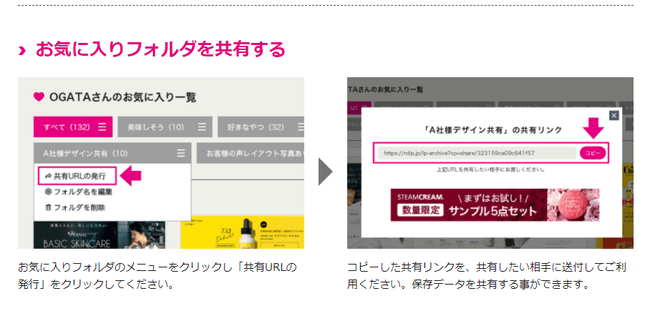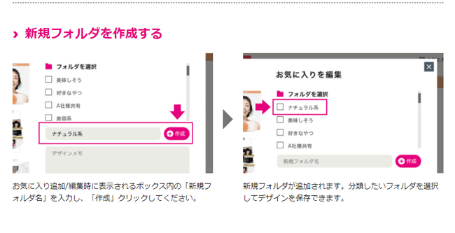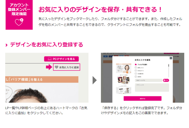 数ある中から、自分の気に入ったデザインを保存する機能や、保存したデザイン一覧を共有できる仕組みも実装されており、デザイン会社ならクライアントにイメージ共有も簡単に行えます。