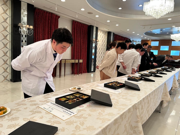 過去に本コンクールへ出展・受賞経験があり、日本料理全国大会で大臣賞を受賞している一の坊グループの料理人達も「今年はレベルが高い」と評価。上位入賞者の出展作品を「細かな技術だけでなく、全体のバランスや、目を惹く配置も評価のポイントだろう」と学びを深めていました。