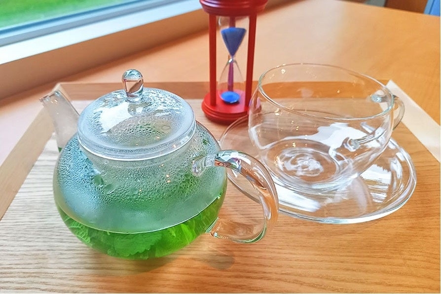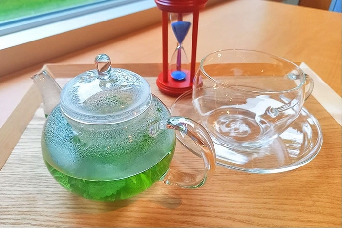 摘み取ったハーブで入れる、フレッシュハーブならではの清涼感溢れる香り高いお茶を、窓外の豊かな自然を眺めながらゆったりと味わっていただく、高原温泉リゾートならではのおもてなしです。