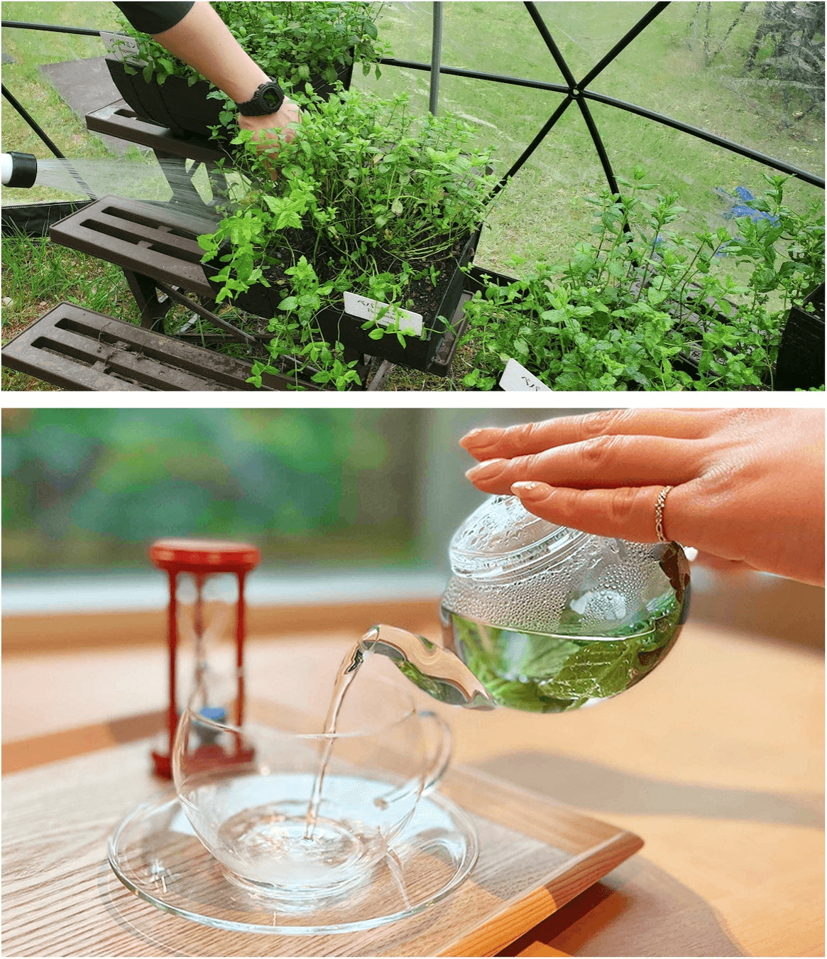 摘み取ったハーブはスタッフが手洗いし、ガラス製の茶器と共にお客様にお渡しします。