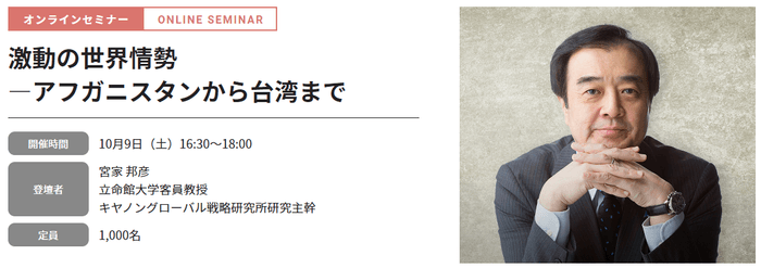 2021年10月9日(土)、立命館大学と立命館大学校友会は、「オール立命館 校友の集い2021」をオンラインで開催します。同日16:30~18:00、どなたでも参加(視聴)可能なライブ配信企画:オンラインセミナー「激動の世界情勢―アフガニスタンから台湾まで」を実施します。講演は、宮家邦彦(立命館大学客員教授・キヤノングローバル戦略研究所研究主幹)が務めます。