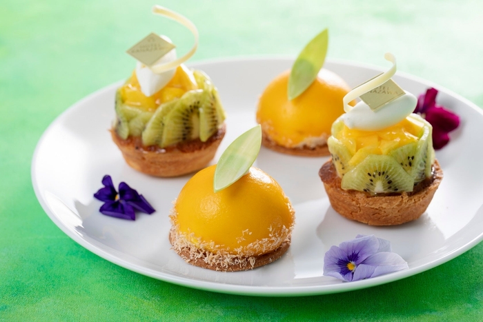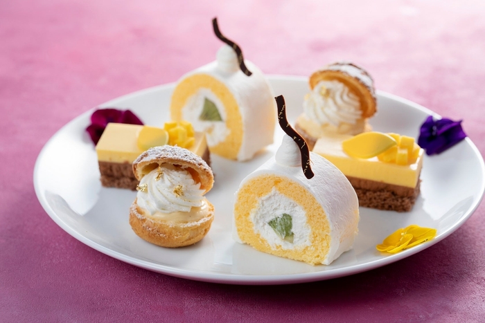 マンゴー、パッションフルーツ、パイナップルなどの南国フルーツが、真夏の太陽をイメージしたイエローデザートに変身。甘さと酸味が絶妙なハーモニーになるよう、繊細に計算し尽くしたスイーツをご用意いたしました。