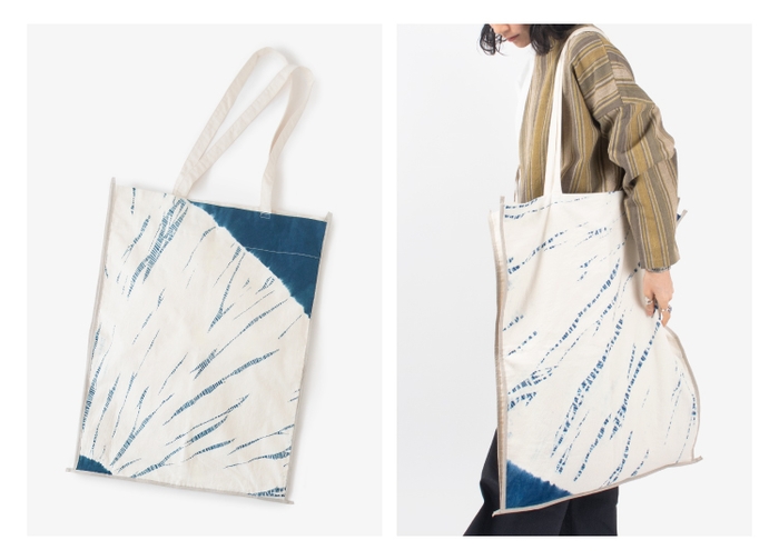 シンプルながら意匠に凝った大きなトートバッグは、エコバッグにも、短い旅のお供にもなるサイズ感です。コットン地の身生地に対してコントラストを楽しめるよう、麻地のパイピングで成形しています。染色は、天然のインド藍を用いて染色作家の手によって全て手作業で絞り染めを施し、生地の手繰り寄せ方、糸で絞り上げる強さや、糸の太さによってその風合いは1点1点異なります。大きな円を彷彿させる絞り方は、HIKEのある熊本県玉名市に伝統として息づく高瀬しぼりに敬意を表し、イメージをしたものです。