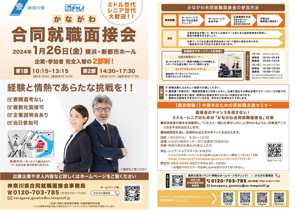 神奈川県は、企業の人材確保および就職・転職希望者の活動を支援する取組として、県内に事業拠点のある企業60社が出展する「かながわ合同就職面接会」を1月26日(金)に新都市ホール(そごう横浜店9階)で幅広い世代の求職者を対象に開催します。
