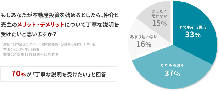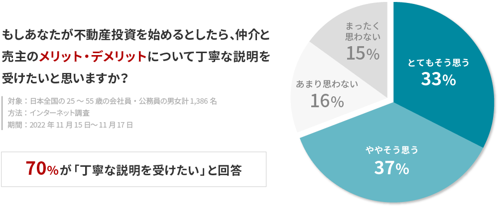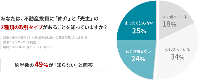全国の会社員・公務員の男女計1,386名に対して行った今回の調査では、不動産投資の成否に大きな影響を及ぼす「仲介」と「売主」の取引タイプについて、全体の約半数となる49%がその存在自体を認知していないという事実が判明したほか、これらの取引タイプについて、10人中7人が「丁寧な説明」を求めていることが明らかになりました。