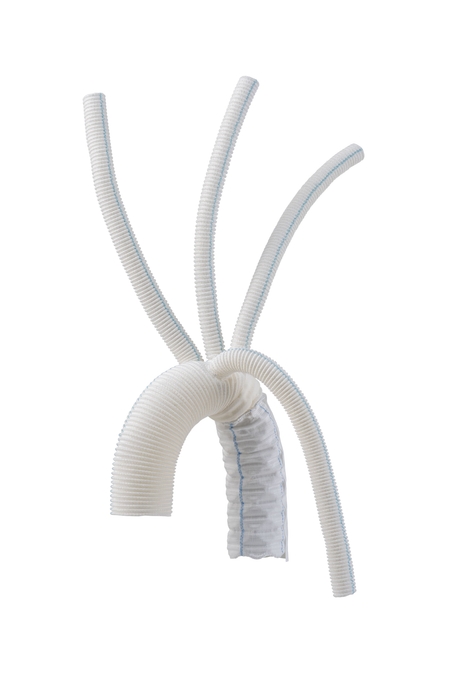 大動脈瘤や大動脈解離などの開胸手術時に使用される体内埋め込み型の医療機器です。従来は別々であった人工血管とオープンステントグラフトが一体化されており、手術で最も時間を要するといわれている吻合の時間を削減することができます。