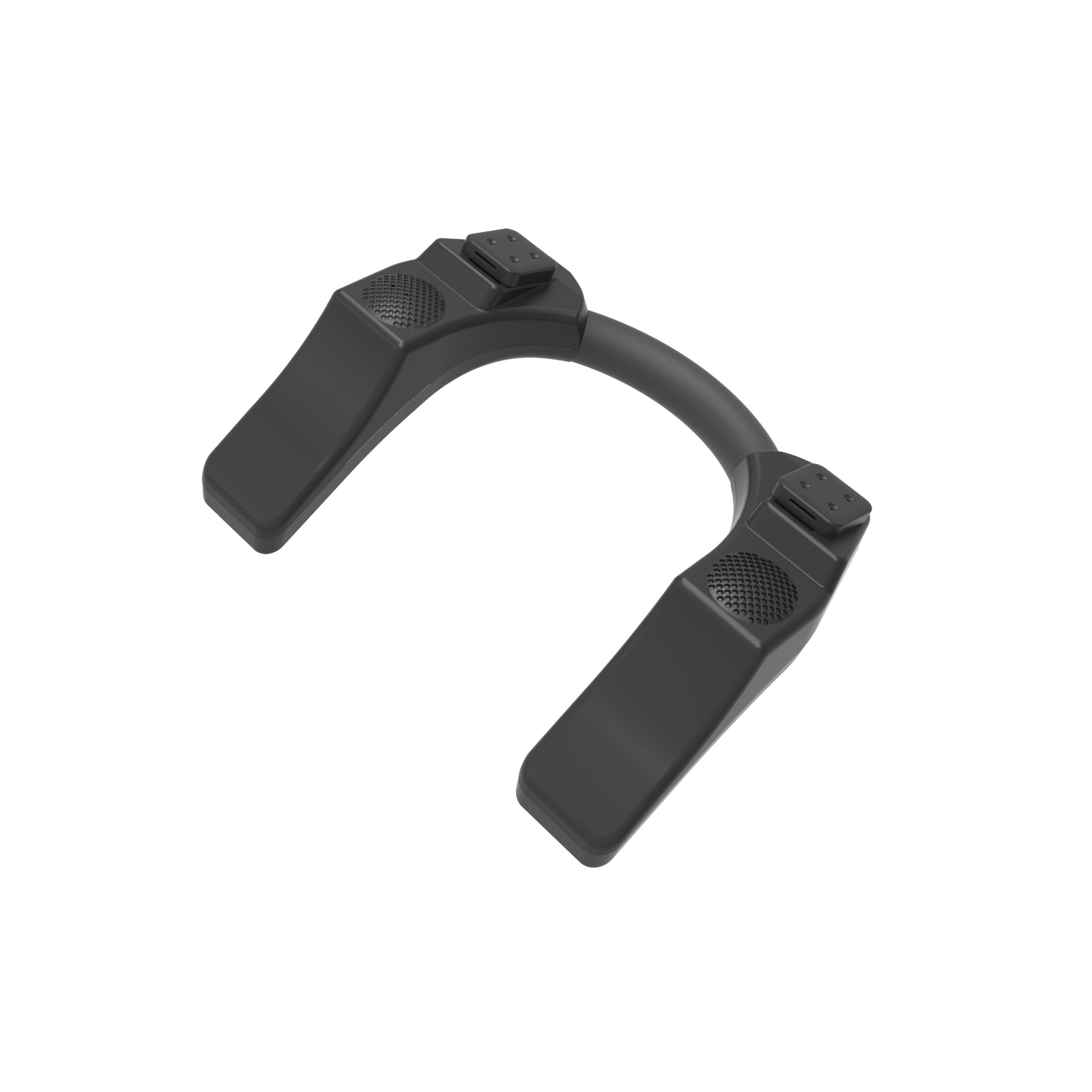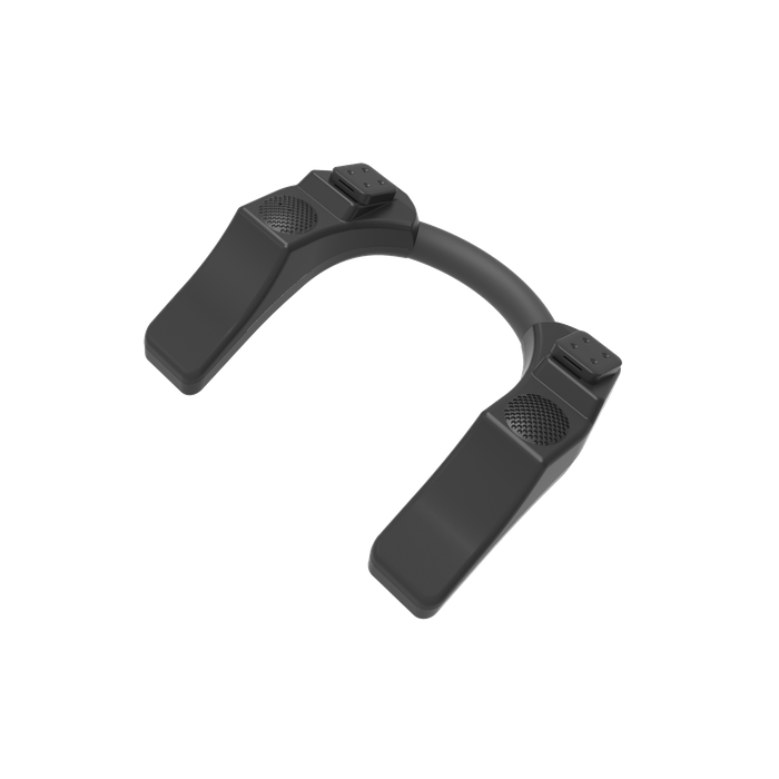 聴覚・視覚支援機能を備えたネックスピーカー型ウェアラブル機器です。日常生活の中では救急車やパトカーのサイレン音など多数の報知音が至るところで発信されています。その一方で、聴覚障がい者はそれらを正しく認識することに課題を抱えています。本システムでは、デバイスに搭載されたマイクが収音する環境音から、それら日常のさまざまな報知音を、事前に深層学習した環境音認識AIが識別するとともに、独自の音源推定アルゴリズムにより音の鳴る方向を特定。搭載されたスピーカーと触覚フィードバックデバイスHAPTIC™が、緊急度に応じた直感的なサウンドおよび多彩な振動表現でユーザーへ報知音の種類やその鳴る方向を伝えます。また、目的地がどこにあるかを正しく認識することが難しい視覚障がい者へは、方向感のある3Dサウンドで目的地まで音で案内することが可能。聴覚・視覚障がい者の自立した行動をサポートします。