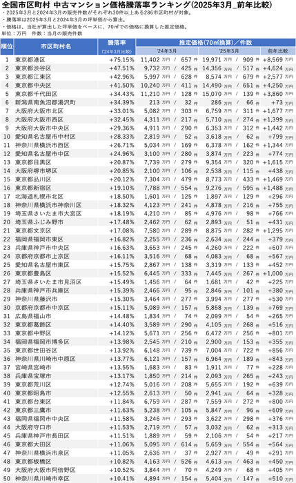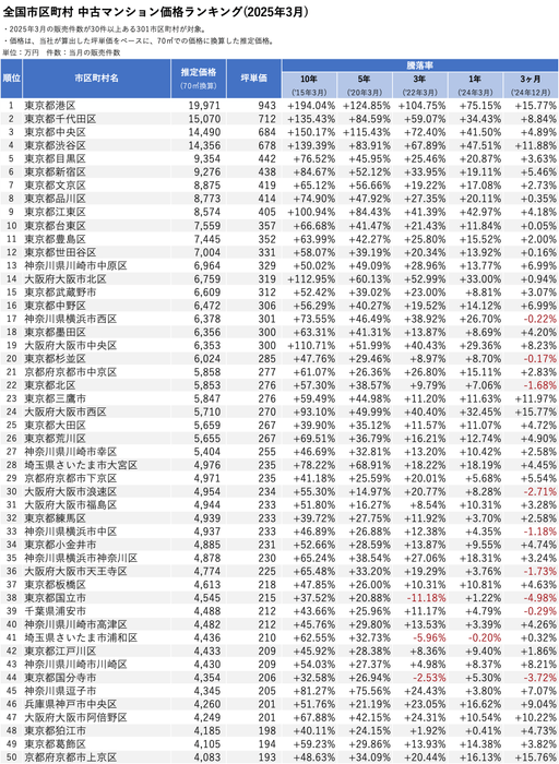 「不動産×WEB×ビッグデータ」の領域で、さまざまな不動産テックサービスを展開する株式会社ワンノブアカインド(本社:東京都港区、代表取締役社長:川島 直也、以下当社)は、当社が運営するマンション情報サイト「マンションレビュー」の保有データを元に、2025年3月の全国市区町村における中古マンションの相場を調査。坪単価をベースに70㎡の価格に換算した「中古マンション価格」*1と価格ランキング上位20件について過去10年間の価格推移、および1年前からの価格上昇率を表す「騰落率」のランキングを発表いたします。
