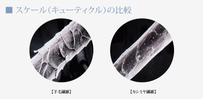 繊維表面は鱗状のスケール(キューティクル)で覆われています。羊毛繊維のスケール形状は、カシミヤより複雑で数も多く凹凸なのに対して、カシミヤ繊維は数が少なく滑らか。動物繊維の中でも特に綺麗なスケール形状を保持しています。スケールが多く突起が大きいと皮膚刺激の原因になります。