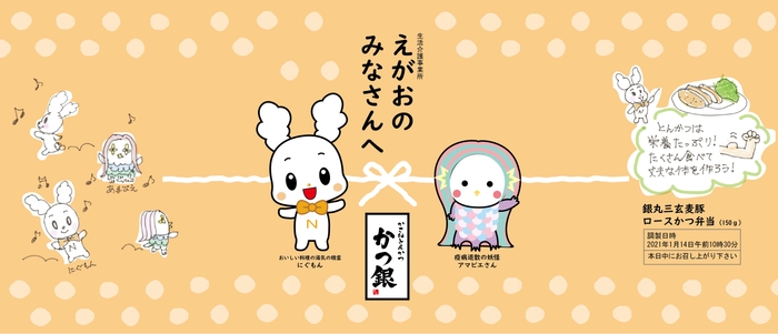 かつ銀の店舗で一番人気のメニュー「銀丸三玄麦豚のロースかつ」に、新型コロナ沈静化を願って、アマビエをあしらった特製とんかつ弁当の贈呈式は、1月14日木曜日、11:00から、指定生活介護事業所「えがお」にて行われた。