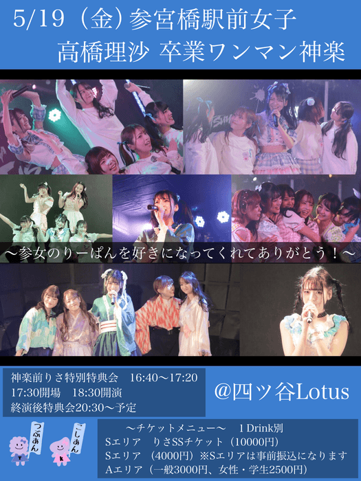 2023年5月19日(金)アデッソ所属のアイドルグループ「参宮橋駅前女子」リーダー高橋理沙の卒業ワンマンライブが四谷Lotusにて開催されます。