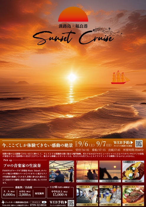 兵庫県・淡路島から出航している「うずしおクルーズ」を運営するジョイポート淡路島株式会社(本社:兵庫県南あわじ市福良、代表取締役:鎌田 勝義)は、2025年9月6日(土)~7日(日)に特別な体験をお届けする「サンセットクルーズ」を運航いたします。夕陽に染まる神秘的な鳴門海峡で、世界最大級の渦潮と美しい夕景、そしてプロの音楽家による生演奏が織りなす、ここでしか味わえない感動をご提供します。