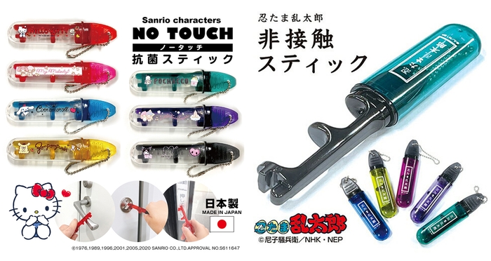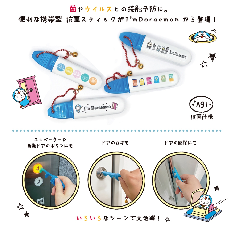 かわいいデザインで多様に使えるノータッチ抗菌スティック! サンリオキャラクターズ・忍たま乱太郎シリーズに続き、<I'm Doraemon>が新登場! 7月2日に河島製作所楽天市場店にて限定先行発売! デザインは全4種類、価格は税込770円です。