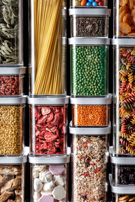 幅や高さを揃えられるモジュール設計のキューブ型は、置く場所を選ばず空間を最大活用し、どこでもすっきり収納できます。軽くて傷に強い樹脂製で、取り出しやすく食洗機にも対応。ガラスのような透明感があり、どこから見ても中身や残量が一目瞭然で、使い勝手が抜群です。