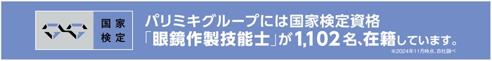 2022年4月より、国の定める「技能検定」の職種に「眼鏡作製職種」が新設され、国家検定資格「眼鏡作製技能士」がスタートし、パリミキグループでは現在1,102 名の合格者が在籍しています(※2024年11月時点) 多様化・高度化するお客様のニーズにあわせて、「適切な診断・治療」と「適切な眼鏡作製」の双方の実現に向け、眼鏡技術者が眼科専門医と連携しつつ、皆様により良い眼鏡を提供し、目の健康を守れるよう、眼鏡作製の技能を高めてまいります。