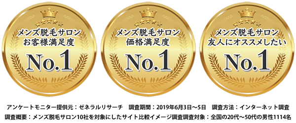 男性専門店として、数々のNO.1を獲得。2019年にメンズ脱毛サロン10社比較の末【お客様満足度NO.1】【価格満足度NO.1】【友人にオススメしたいNO.1】の3部門にて3冠達成。