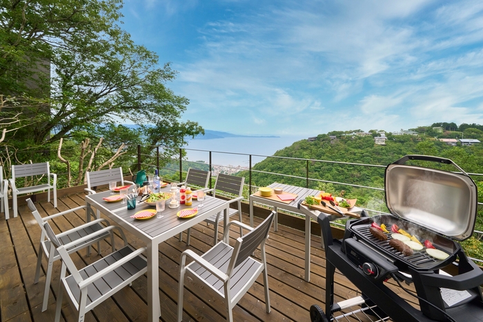 人気のリゾートエリア「熱海」の高台に佇む貸別荘。温泉を楽しめるバスルームと相模湾を一望するオーシャンビューのテラスを備え、最上級のリゾート空間をお楽しみいただけます。