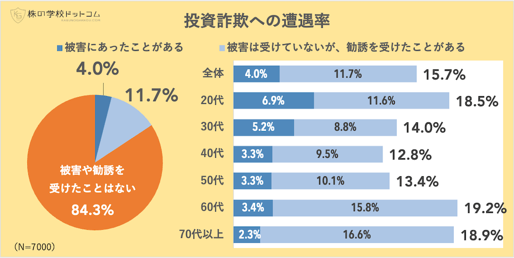 そこで、オンライン株式スクール「株の学校ドットコム」(運営会社:株式会社トレジャープロモート、東京都千代田区、代表取締役社長:瀬川 丈)では、全国の20歳以上の7000人を対象として、投資詐欺被害の実態調査を行いました。