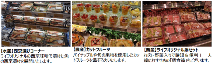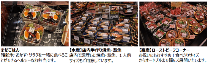 通勤や通学で駅を利用される方が多いため、惣菜の品ぞろえに力を入れ、ヘルシー系からガッツリメニューまでライフ自慢のお弁当やお寿司を種類豊富に品ぞろえいたします。また、手作りニーズにお応えする鮮度抜群の生鮮食品や、単身・共働き世帯のお客様向けに、便利な時短・簡便商品を豊富にご用意いたします。