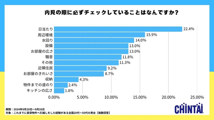 ・内見時は「日当たり」(22.4%)が最も重視され、「周辺環境」(15.9%)や「水回り」(14.0%)が続きました。