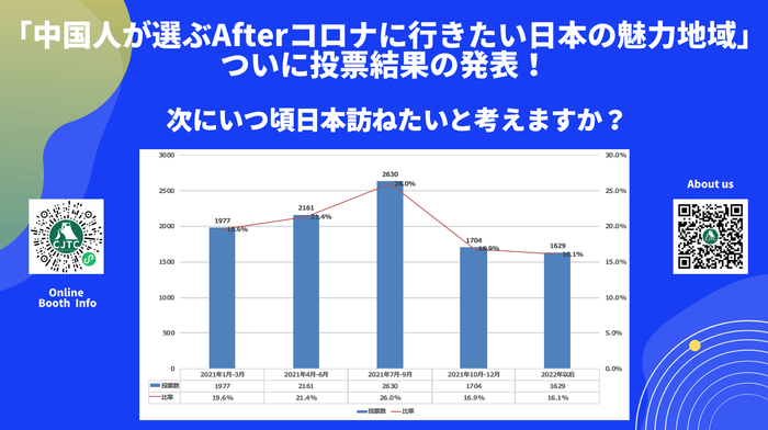 本年サミットのオンライン出展の一環として、「Afterコロナに行きたい日本の地域魅力特集」の特設ページを開設し、12月8日から15日まで、中国現地ユーザーを対象に、魅力と感じた地域の投票と訪日意識調査を同時に実施しました。一週間のうち、有効解答数は10,101点を回収したほか、2000万以上のインプレッションと、3万以上のアクセスを獲得しました。