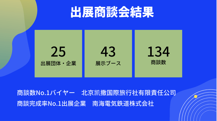 3回目となる今年は、新型コロナウイルスの影響で、初めてのオンライン上で開催する運びとなりました。日中両国の旅行業界キーマンが一堂に会し、オンライン上で日本の魅力を中国に発信したほか、日本・中国の旅行事業者をマッチングするためのオンライン上展示会・商談会も行われました。その結果、当日フル出席者数が400名、商談数が134点、累計視聴回数4000回に達しており、過去最大規模となりました。
