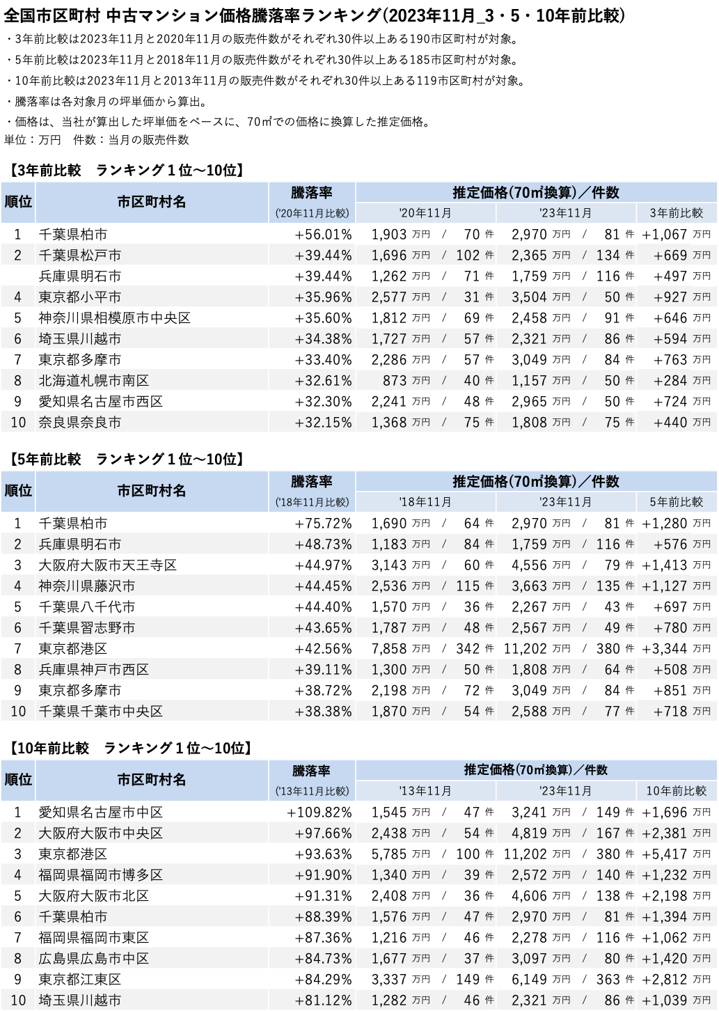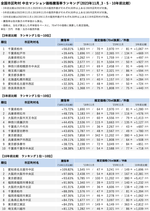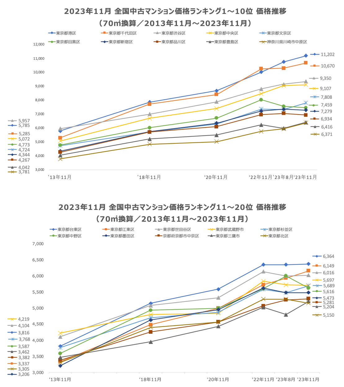 調査。坪単価をベースに70㎡での価格に換算した「中古マンション価格」*1と価格ランキング上位20件について過去10年間の価格推移、および1年前からの価格の上昇率を表す「騰落率」のランキングを発表いたします