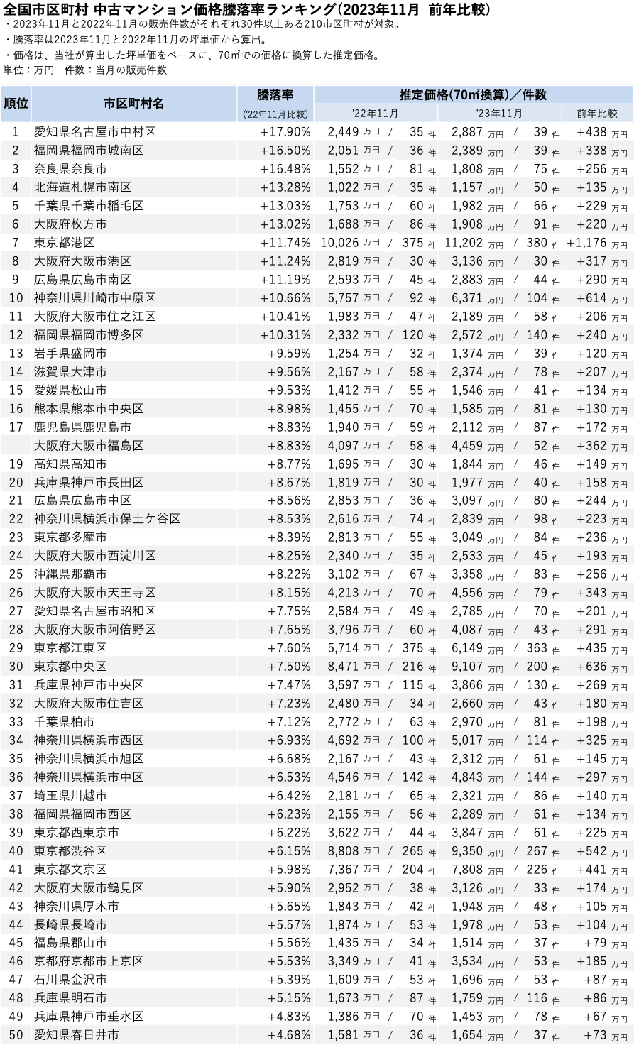 「マンションレビュー」2023年11月 全国市区町村 中古マンション価格/騰落率ランキング100を発表