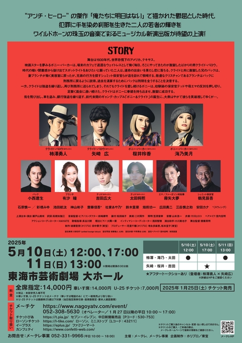 メ~テレ(名古屋テレビ放送)、メ~テレ事業(名古屋テレビ事業)主催、ミュージカル『ボニー&クライド』愛知公演が5月10日 (土) 〜 5月11日 (日)に東海市芸術劇場 大ホール(愛知県東海市大田町下浜田1016番地)にて上演されます。