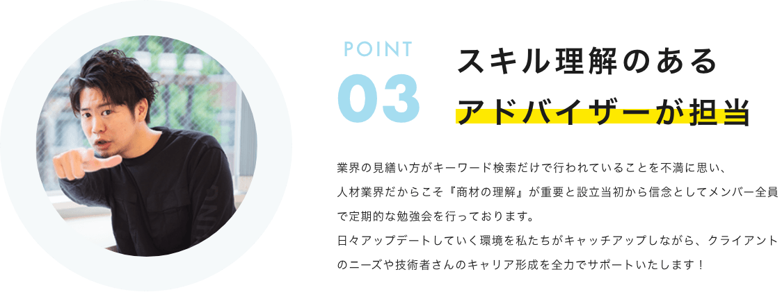 立ち上げ当初より他社エージェントへのコンサルティングを行なってきた中で技術者へのキャリア相談、面談テクニックの教授、経歴書やポートフォリオの記載アドバイスなど対外的にも技術者の支援を行なってきた。