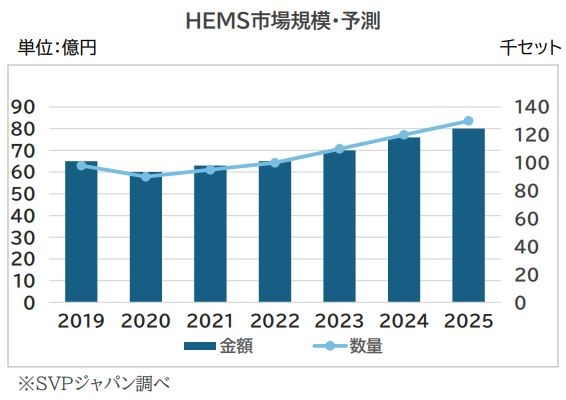 2022年のHEMS市場は、65億円、約10万セットの出荷を記録。新型コロナの影響で一時的に縮小しましたが、市場は回復傾向にあります。ZEHの普及や卒FIT住宅へのHEMS導入拡大が見込まれる中、2023年から2025年にかけて市場は年率5~10%の成長が予測され、2025年には80億円、年間13万セットに達すると見られています。