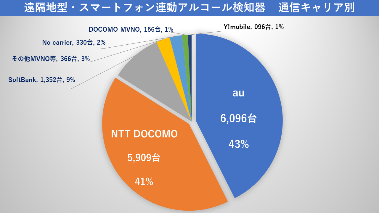 2024年1月時点でお客様がアルコール検知器と接続して使用しているスマートフォンは約14,000台となっています。以下に、通信キャリア、使用端末の概況をお知らせ致します。