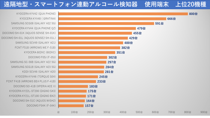 アルコール検知システム、IT点呼システム、遠隔点呼システム、自動点呼システム、運行管理システムを開発・販売する東海電子株式会社(本社:静岡県富士市 代表取締役 杉本 哲也)は、この度、遠隔地型(スマートフォン連動型)アルコール検知器の最新実績及び通信キャリア別・端末別スマートフォンの使用状況をお知らせ致します。