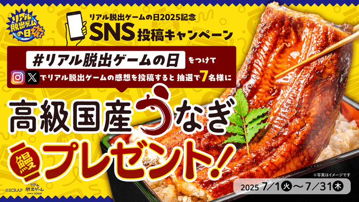 2025年7月1日(火)~2025年7月31日(木)の期間、InstagramまたはXで「#リアル脱出ゲームの日」のハッシュタグを付けて、リアル脱出ゲームの感想を投稿すると、高級国産鰻が抽選で7名様に当たる「リアル脱出ゲームの日2025記念 SNS投稿キャンペーン」を開催します。