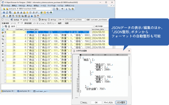 最新バージョンでは、JSON(JavaScript Object Notation)のデータ型に対応し、JSONデータの表示や編集が可能になりました。JSONは、軽量なデータフォーマットとしてAPIやデータ分析といった分野で広く使用されています。