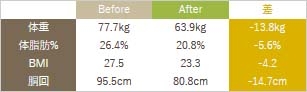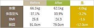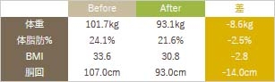 平均で体重-5.9kg、ウエスト-9cm!一足お先に「8週間ダイエット献立セット」を実行した方たちには、ダイエット*成功者が続々誕生しています。体重、ウエスト以外にも平均で体脂肪率-3%、BMI-2.4など、確かな結果が実証されています。