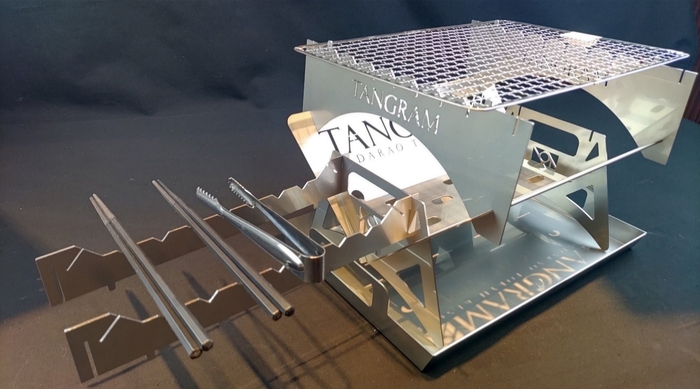 タングラムはアウトドアを楽しめる周辺環境から、アウトドアの拠点としてご利用いただけることが特徴です。そこで、アウトドアで人気上昇中の「焚火」を楽しんでいただくために地元企業「伸商機工株式会社」と提携し、オリジナルの焚火台を製作いたしました。底面が A4 サイズ程度のコンパクトさが特徴で、組み立ても簡単なため持ち運びにも便利です。タングラム内ショップと、インターネットで販売いたします。