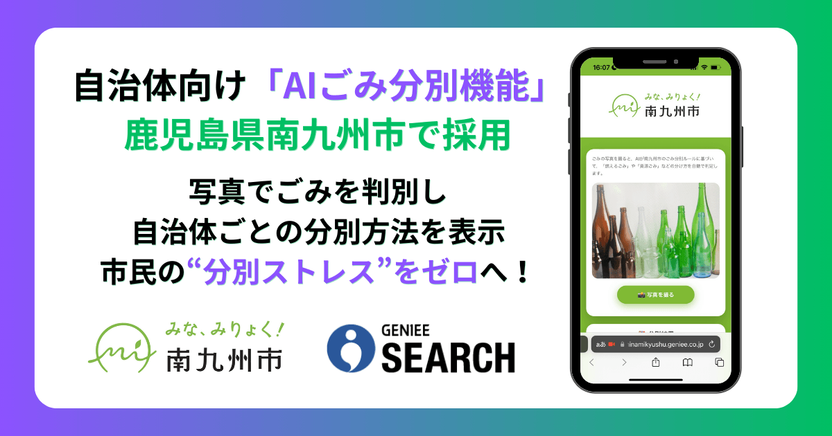 ジーニーの自治体向け「AIごみ分別機能」、鹿児島県南九州市で採用