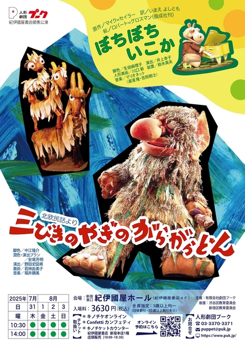 人形劇団プーク主催、紀伊國屋ホール 夏休み公演『三びきのやぎのがらがらどん/ぼちぼちいこか』が2025年7月31日 (木) 〜 2025年8月3日 (日)に紀伊國屋ホール(東京都新宿区新宿3-17-7)にて上演されます。