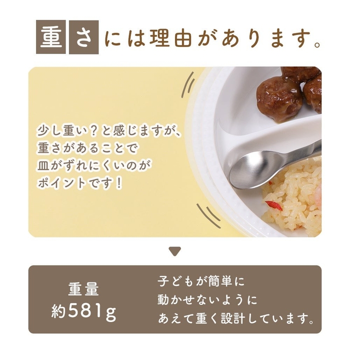 これは、重さがあることでお皿がずれにくくなり、子どもが簡単に動かせないよう、あえて重く設計しています。