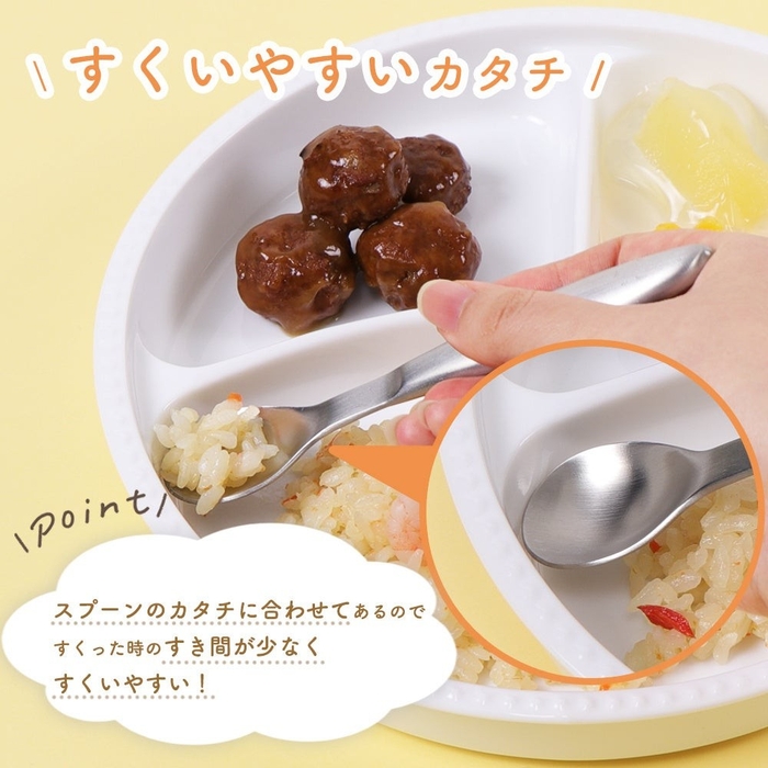 この仕切り皿の内側はスプーンの形に合わせてあるので、すくった時のすき間が少なく、食べ物がすくいやすくデザインされています。