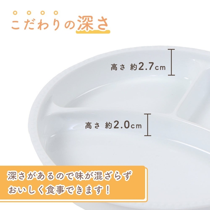 また、皿の深さは約2.7cm、仕切り部分の高さは約2cmあるため、立ち上がりを使ってスムーズにすくうことができます。
