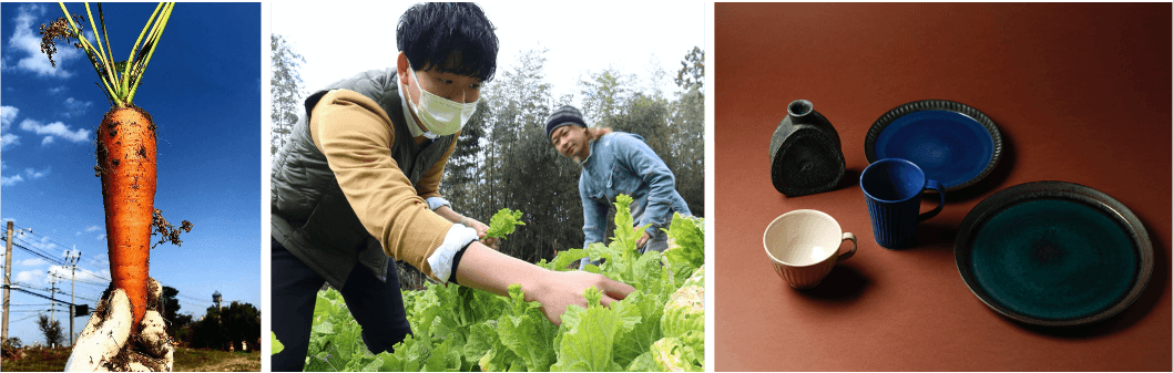 店舗に商品を提供する生産者たちは、その経歴も様々です。野菜を提供する農家の中には、8つの“移住者“農家のみで構成された「オーガニックファーマーズ」というチームがいます。糸島に魅了され移住してきた彼らは、BROF理論などの有機栽培技術を学びながら、糸島の自然と調和したこだわりの野菜を育てています。クラフトを提供する作家たちも、会社員を辞めて陶芸を始めた作家、夫婦で工房を開く作家、ヨットでの太平洋縦断の末陶芸に出会った作家など、個性あふれる“おもしろい”人たちが集まっています。