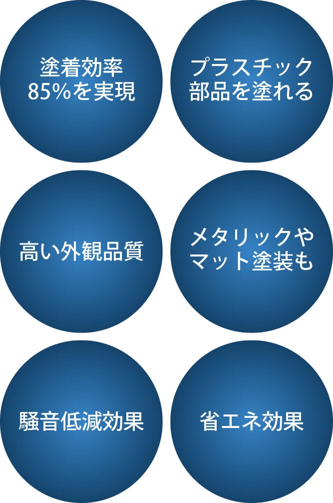 また、従来のスプレー塗装に比べてブースの風量を抑えることができるため騒音低減効果があり、廃棄塗料や消費電力を減らす省エネ効果があるためカーボンニュートラルやサーキュラーエコノミーの実現に貢献できます。