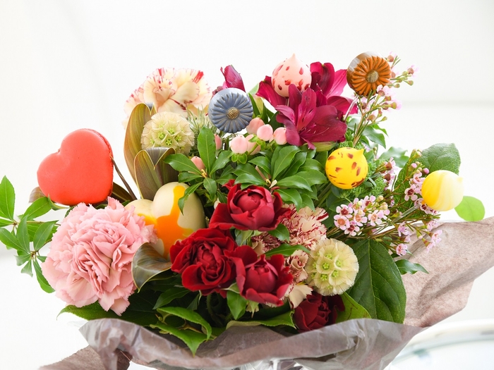 母の日用にセレクトした生花とお花やハート型のボンボンショコラ(5種)、ビックマカロン、プチガトーで期間限定のブーケを作りました。ブーケを楽しんだあとは、ショコラなどはお召し上がりいただけます(お持ち帰りも可能です)。