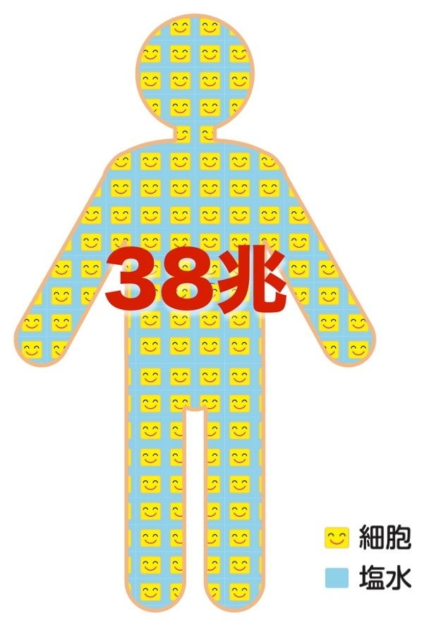 血液には、塩が約0.9%の濃さで溶けていて、いつも同じ濃さになっているおかげで、体じゅうの38兆個の細胞のまわりにもいつも同じ濃さの塩水があります。いつも同じ濃さの塩水につつまれているので、細胞はちゃんとはたらけるのです。